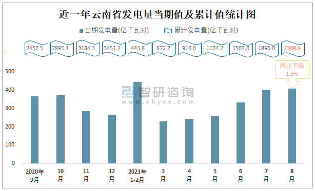 近一年云南省發電量當期值及累計值統計圖