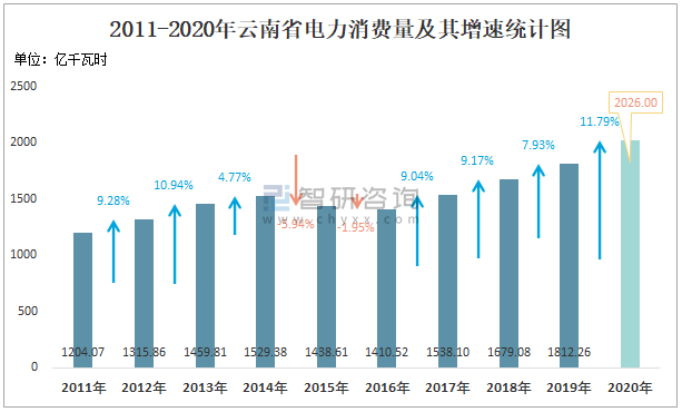 2011-2020年云南省電力消費量及其增速統計圖