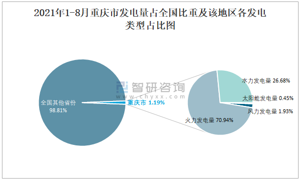 2021年1-8月重慶市發電量占全國比重及該地區各發電類型占比圖