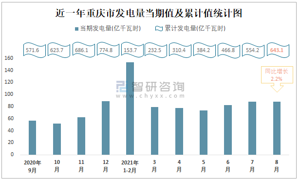 近一年重慶市發電量當期值及累計值統計圖