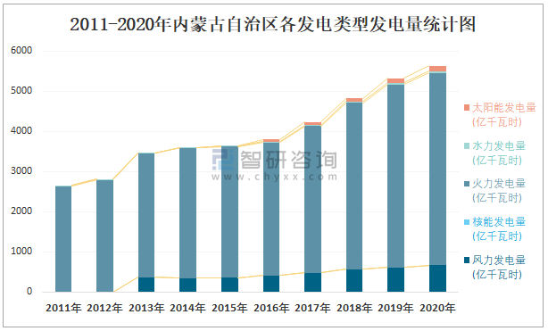 2011-2020年內蒙古自治區各發電類型發電量統計圖