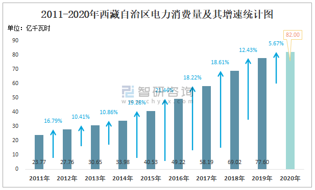 2011-2020年西藏自治區(qū)電力消費(fèi)量及其增速統(tǒng)計(jì)圖