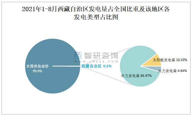 2021年1-8月西藏自治區(qū)發(fā)電量占全國比重及該地區(qū)各發(fā)電類型占比圖