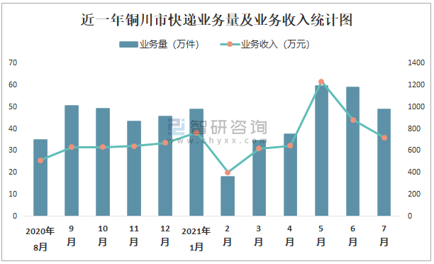 近一年銅川市快遞業務量及業務收入統計圖