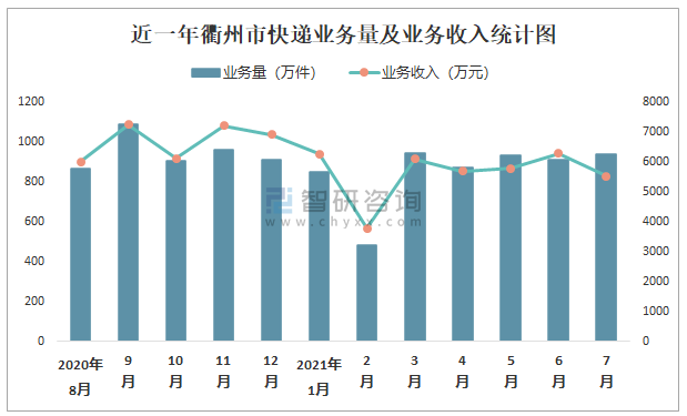 近一年衢州市快遞業務量及業務收入統計圖
