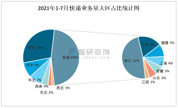 2021年1-7月快遞業務量大區占比統計圖