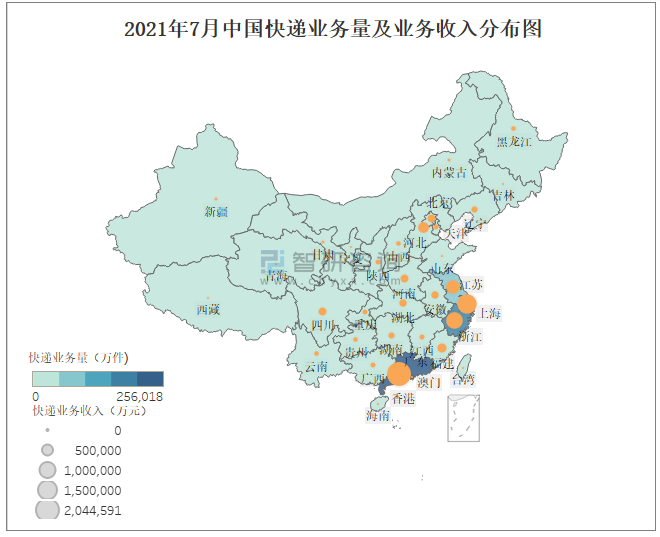 2021年7月中國快遞業(yè)務(wù)量及業(yè)務(wù)收入分布圖