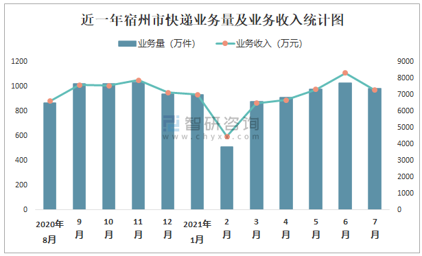 2016-2020年宿州市快遞業務量及業務收入統計圖