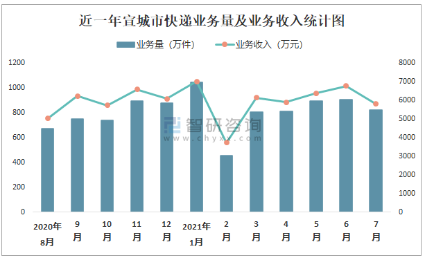 2021年7月宣城市快遞業務量與業務收入分別為823萬件和5798.75萬元