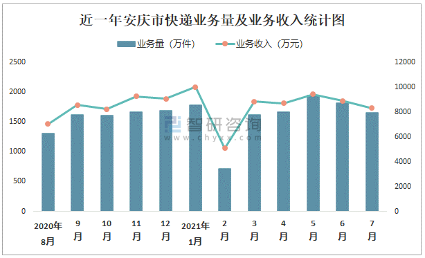 近一年安慶市快遞業務量及業務收入統計圖