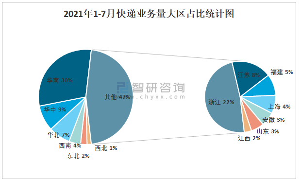 根據各省市郵政局數據可知:2021年1-7月快遞業務量主要集中在華東、華南、華中地區;2021年1-7月快遞業務量地區分布不均勻,其中華東地區占比最大,特別是浙江省貢獻了最多業務量;2021年7月安徽下轄地區快遞業務量及業務收入排行榜中,黃山市快遞業務量排名比較靠后。