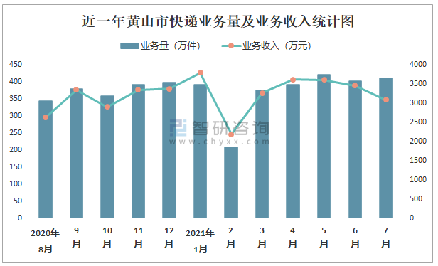 根據各省市郵政局數據可知:2021年7月黃山市快遞業務量為410.44萬件,業務收入為3090.7萬元;2021年1-7月黃山市快遞累計業務量為2602.84萬件,同比增長41.52%,累計業務收入為23034.75萬元,同比增長19.39%。