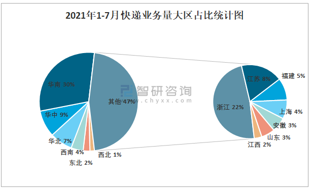 2021年1-7月快遞業務量大區占比統計圖