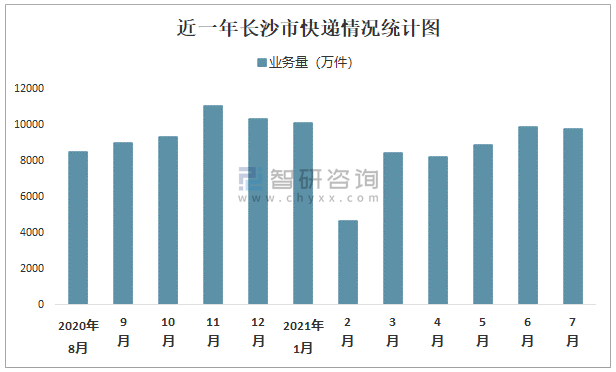 根據各省市郵政局數據可知:2021年7月長沙市快遞業務量為9811.72萬件;2021年1-7月長沙市快遞累計業務量為60066.42萬件,同比增長34.15%。