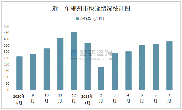 根據各省市郵政局數據可知:2021年7月郴州市快遞業務量為381.44萬件;2021年1-7月郴州市快遞累計業務量為2237.66萬件,同比增長46.05%。
