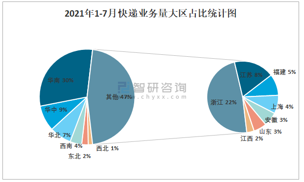 根據各省市郵政局數據可知:2021年1-7月快遞業務量主要集中在華東、華南、華中地區;2021年1-7月快遞業務量地區分布不均勻,其中華東地區占比最大,特別是浙江省貢獻了最多業務量;2021年7月江西下轄地區快遞業務量及業務收入排行榜中,撫州市快遞業務量排名靠后。