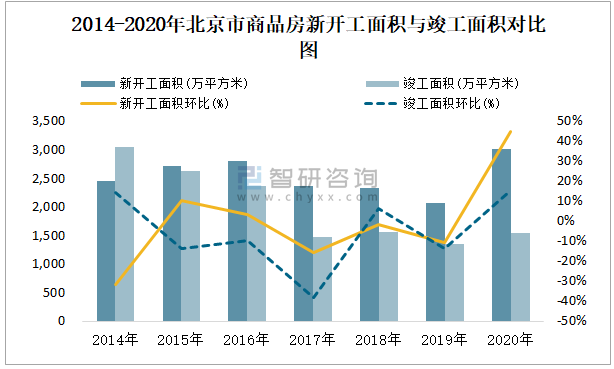 2014-2020年北京市商品房新開工面積與竣工面積對比圖