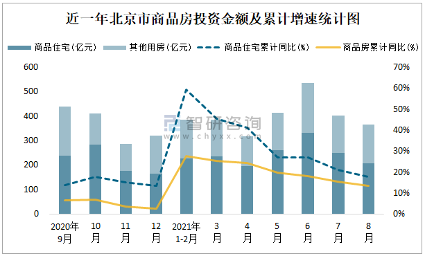 近一年北京市商品房投資金額及累計增速統(tǒng)計圖