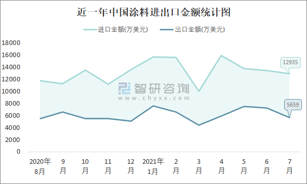 根據(jù)中國石油和化學工業(yè)聯(lián)合會數(shù)據(jù)顯示:2021年7月中國涂料進口數(shù)量為1.6萬噸,出口數(shù)量為1.6萬噸;進口金額為12935萬美元,出口金額為5659萬美元;近一年中國涂料出口總金額小于進口總金額,貿(mào)易逆差為主,7月進口均價8084.4美元/噸。