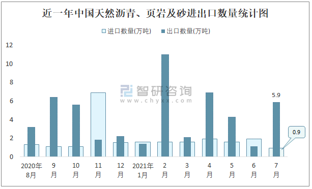 2021年7月中國天然瀝青、頁巖及砂進出口數量分別為0.9萬噸和5.9萬噸