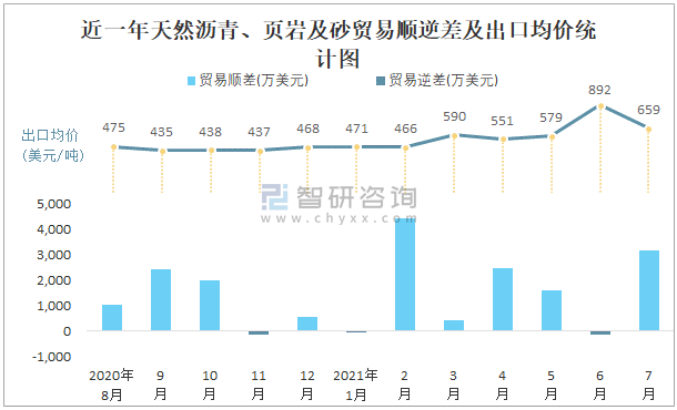 根據中國石油和化學工業聯合會數據顯示:2021年7月中國天然瀝青、頁巖及砂進口數量為0.9萬噸,出口數量為5.9萬噸;進口金額為752萬美元,出口金額為3888萬美元;近一年中國天然瀝青、頁巖及砂出口總金額大于進口總金額,貿易順差為主,7月出口均價659美元/噸。