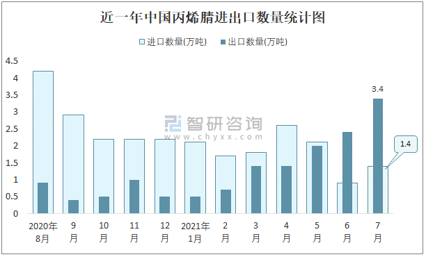 根據(jù)中國石油和化學(xué)工業(yè)聯(lián)合會數(shù)據(jù)顯示:2021年7月中國丙烯腈進口數(shù)量為1.4萬噸,出口數(shù)量為3.4萬噸;進口金額為3376萬美元,出口金額為7799萬美元;近一年中國丙烯腈出口總金額小于進口總金額,貿(mào)易逆差為主,7月進口均價2411.4美元/噸。