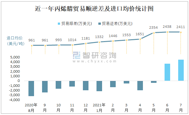 近一年丙烯腈貿(mào)易順逆差及進口均價統(tǒng)計圖
