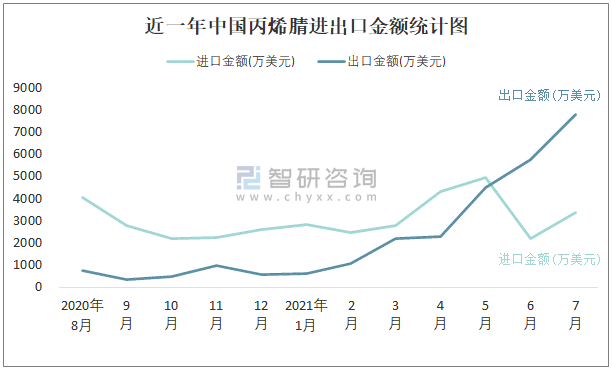 近一年中國丙烯腈進出口金額統(tǒng)計圖