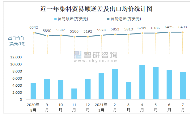 近一年染料貿(mào)易順逆差及出口均價統(tǒng)計圖