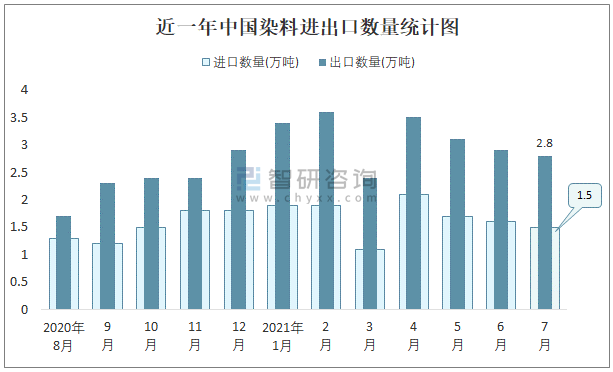近一年中國染料進出口數(shù)量統(tǒng)計圖