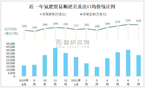 根據中國石油和化學工業聯合會數據顯示:2021年7月中國氮肥進口數量為0.3萬噸,出口數量為136.7萬噸;進口金額為185萬美元,出口金額為32596萬美元;近一年中國氮肥出口總金額大于進口總金額,貿易順差為主,7月出口均價238.4美元/噸。