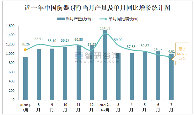 根據(jù)國家統(tǒng)計局?jǐn)?shù)據(jù)顯示:2021年7月中國衡器(秤)產(chǎn)量為1004萬臺,同比增長4.61%;2021年1-7月中國衡器(秤)累計產(chǎn)量為6692.2萬臺,同比增長40.43%;2015-2020年中國衡器(秤)產(chǎn)量總體呈現(xiàn)上升趨勢,2020年達(dá)到最高。