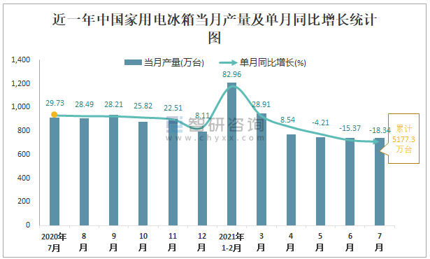 根據(jù)國家統(tǒng)計局數(shù)據(jù)顯示:2021年7月中國家用電冰箱產(chǎn)量為741萬臺,同比下降18.34%;2021年1-7月中國家用電冰箱累計產(chǎn)量為5177.3萬臺,同比增長11.32%;2015-2020年中國家用電冰箱產(chǎn)量2018年跌至最低,此后逐年遞增。
