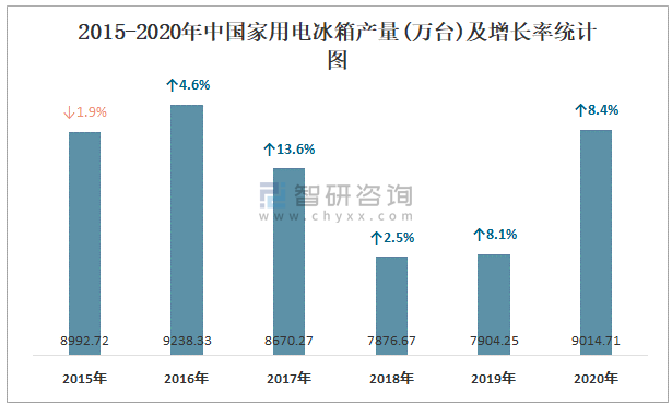 2015-2020年中國家用電冰箱產(chǎn)量及增長率統(tǒng)計圖