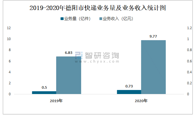 2019-2020年德陽市快遞業務量及業務收入統計圖