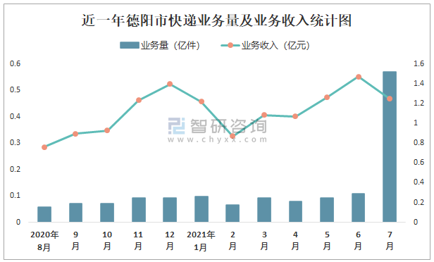近一年德陽市快遞業務量及業務收入統計圖