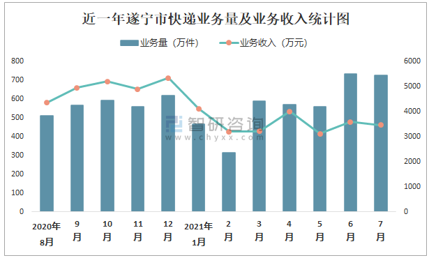 近一年遂寧市快遞業(yè)務(wù)量及業(yè)務(wù)收入統(tǒng)計圖