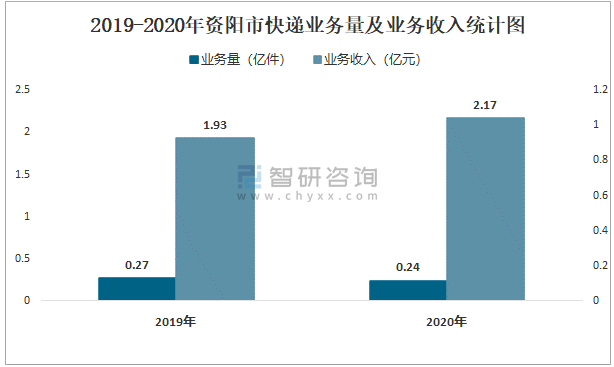 2019-2020年資陽市快遞業務量及業務收入統計圖