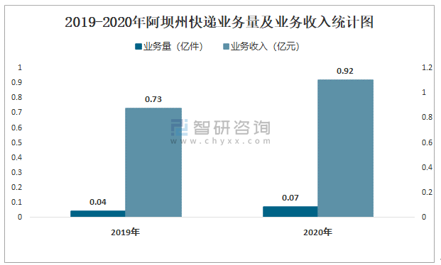 2019-2020年阿壩州快遞業務量及業務收入統計圖
