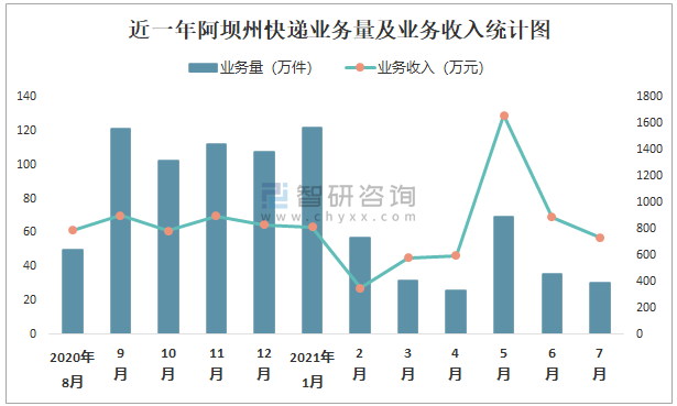 近一年阿壩州快遞業務量及業務收入統計圖