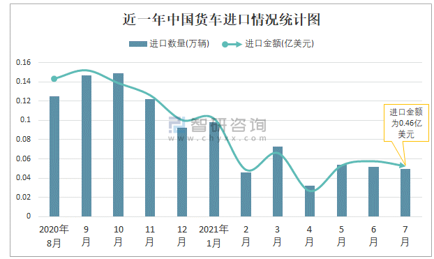 根據(jù)中國(guó)海關(guān)數(shù)據(jù)顯示:2021年7月中國(guó)貨車進(jìn)口數(shù)量為0.05萬(wàn)輛,同比下降48.2%,進(jìn)口金額為0.46億美元,同比下降50%,2021年7月中國(guó)貨車出口數(shù)量為3.15萬(wàn)輛,同比增長(zhǎng)121.2%,出口金額為5.07億美元,同比增長(zhǎng)126.8%;2021年1-7月中國(guó)貨車進(jìn)口數(shù)量為0.4萬(wàn)輛,進(jìn)口金額為3.57億美元,出口數(shù)量為20.32萬(wàn)輛,出口金額為32.42億美元。