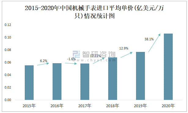 2015-2020年中國(guó)機(jī)械手表進(jìn)口平均單價(jià)(億美元/萬(wàn)只)情況統(tǒng)計(jì)圖
