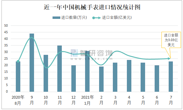 根據(jù)中國(guó)海關(guān)數(shù)據(jù)顯示:2021年7月中國(guó)機(jī)械手表進(jìn)口數(shù)量為23萬(wàn)只,同比增長(zhǎng)2.9%,進(jìn)口金額為3.03億美元,同比增長(zhǎng)32.4%,2021年1-7月中國(guó)機(jī)械手表進(jìn)口數(shù)量為159萬(wàn)只,進(jìn)口金額為21.75億美元。