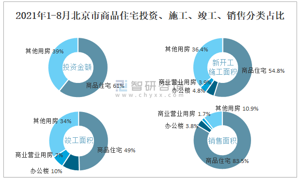 2021年1-8月北京市商品住宅投資、施工、竣工、銷售分類占比