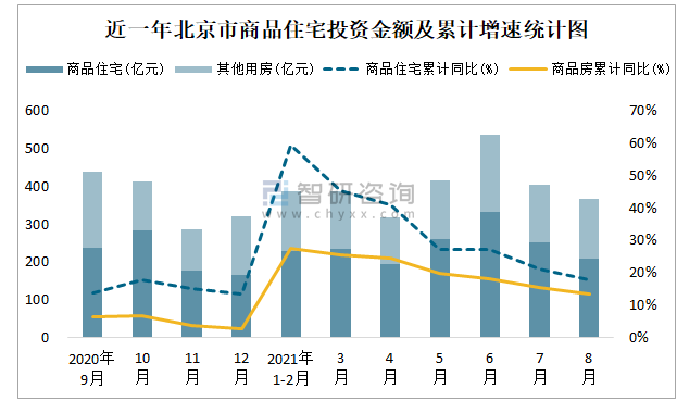 根據國家統計局數據統計可知:2021年8月北京市房地產開發投資商品房投資金額為366.01億元(其中商品住宅為208.35億元,辦公樓、商業營業用房等其他用房157.66億元);2021年1-8月北京市房地產開發投資商品住宅累計投資金額為1709.9億元,投資金額累計同比增長17.7%。