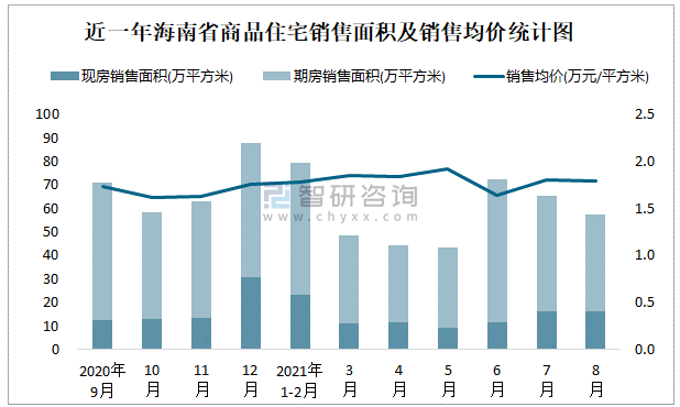 2021年8月海南省銷售商品住宅57.45萬平方米 銷售均價約為1.8萬元/平方米