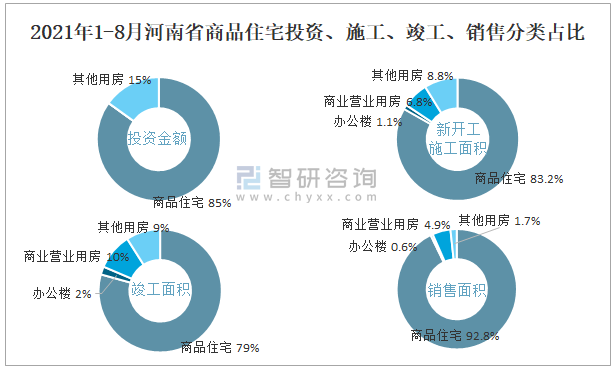 2021年1-8月河南省商品住宅投資、施工、竣工、銷售分類占比