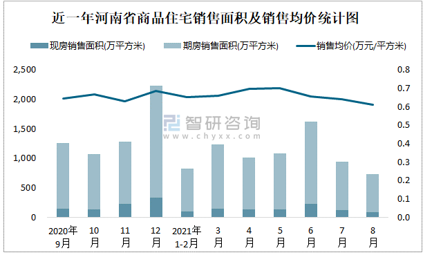 根據國家統計局數據可知:2021年8月河南省商品住宅銷售面積為737.28萬平方米(其中銷售現房91.83萬平方米,期房645.45萬平方米),銷售額為450.33億元,銷售均價約為0.61萬元/平方米;2021年1-8月河南省商品住宅累計銷售面積為7473.28萬平方米,銷售面積累計同比增長6.9%,累計銷售額為4943.02億元,銷售額累計同比增長8.8%;近一年河南省商品住宅銷售均價2021年5月達到最高值,此后有所下滑,期房銷售面積遠高于現房銷售面積。