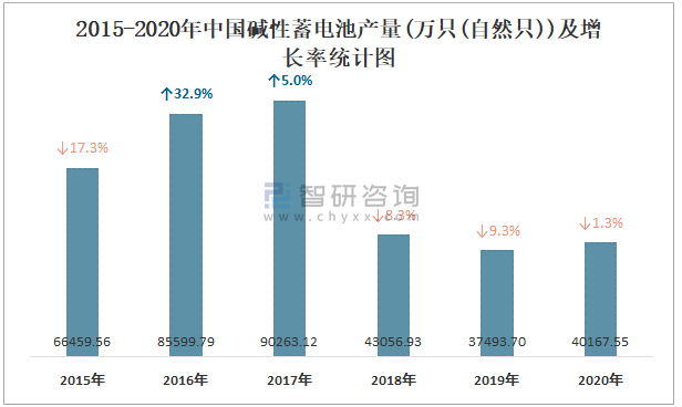 2015-2020年中國堿性蓄電池產量及增長率統計圖