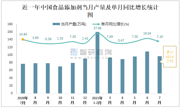根據(jù)國家統(tǒng)計(jì)局?jǐn)?shù)據(jù)顯示:2021年7月中國食品添加劑產(chǎn)量為96.6萬噸,同比增長7.16%;2021年1-7月中國食品添加劑累計(jì)產(chǎn)量為632.6萬噸,同比增長10.44%;2015-2020年中國食品添加劑產(chǎn)量2018年跌至最低,此后逐年遞增。